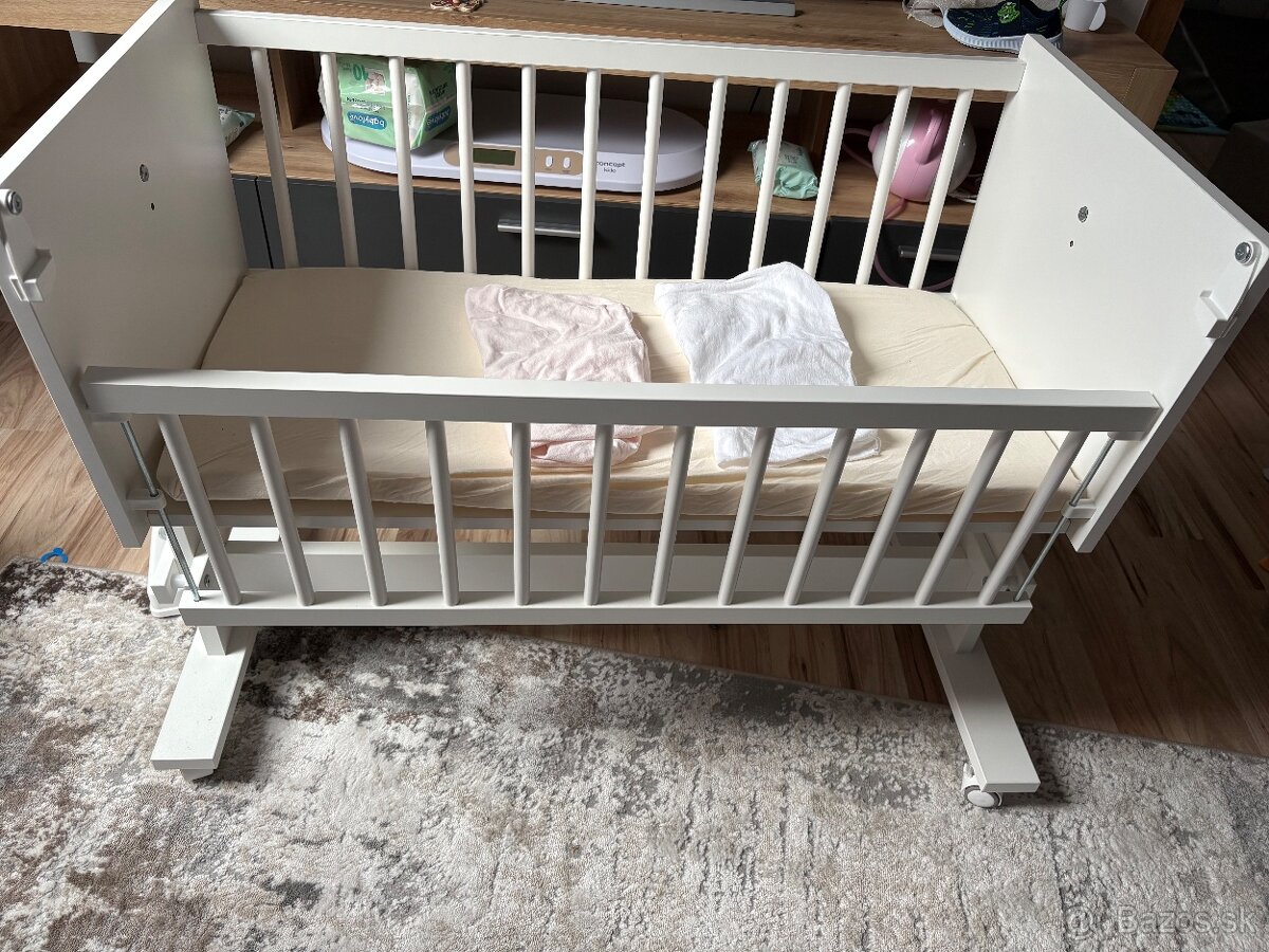 Detská postieľka / kolíska – biela, s matracom - [16.3. 2026]Predáme krásnu bielu postieľku pre bábätko, pevná a stabilná, používaná s láskou. Vo veľmi peknom stave, vhodná od narodenia. Súčasťou je aj pohodlný matrac. Jednoduchý, nadčasový dizajn, ktorý zapadne do každej detskej izbičky.