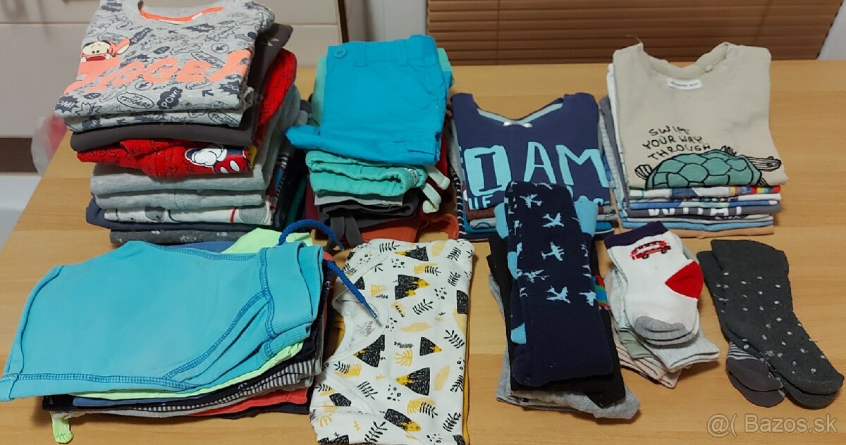 Predám balík oblečenia pre chlapca vo veľkosti 74/80, 80/86, 92/98. Sada obsahuje - tepláčky, mikiny, tričká s dlhým a krátkym rukávom, body, kraťasy + doplnky - ponožky, pančušky, tielka, spodné prádlo. Veci sú používané, ale bez dier, žmolkov. Vhodné na donosenie okolo domu, na dvor, do záhrady.