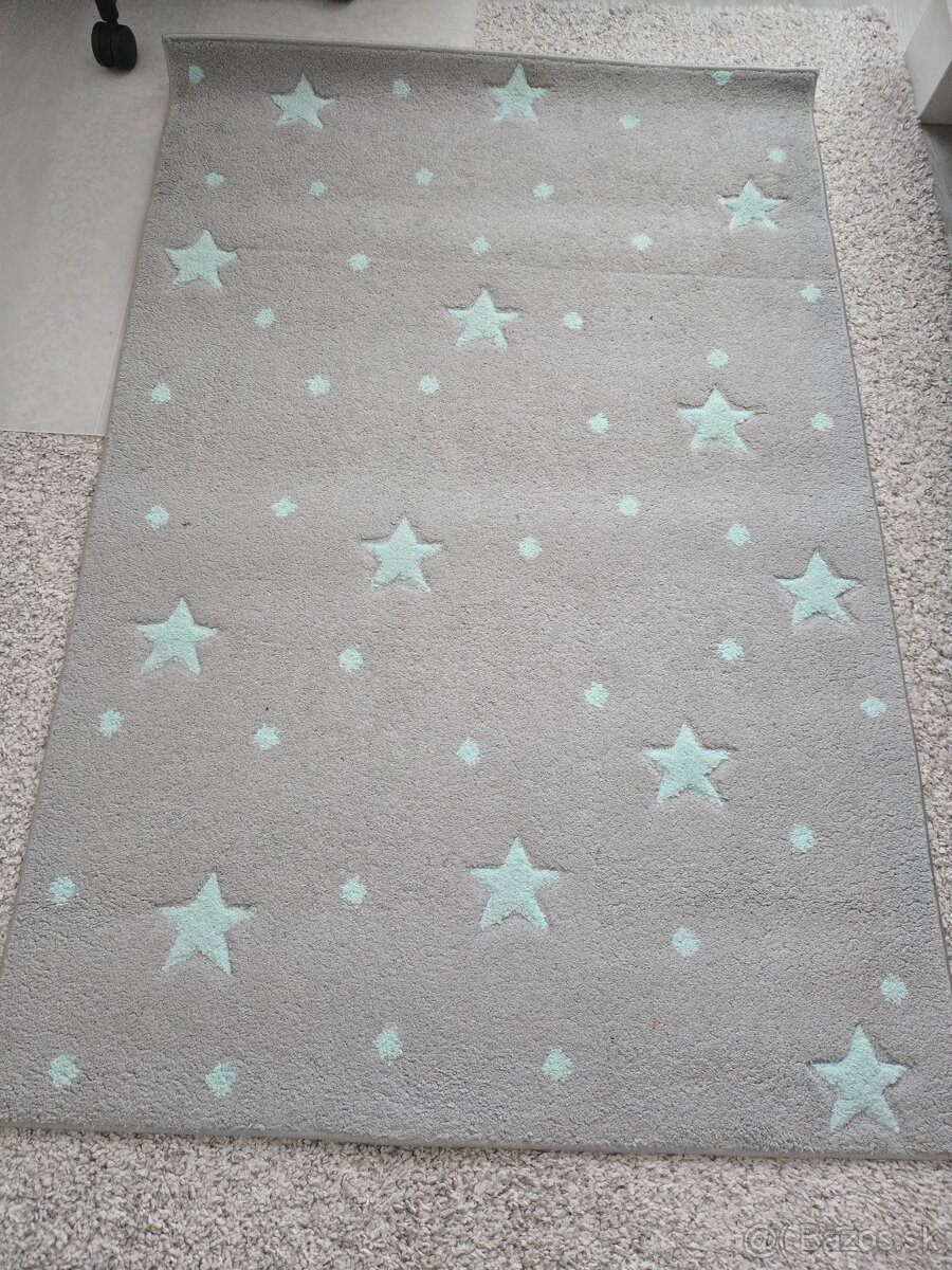 Predam pouzivany koberec sivy s mentolovymi hviezdickami, velkost 100cm x 150cm. Osobny odber.