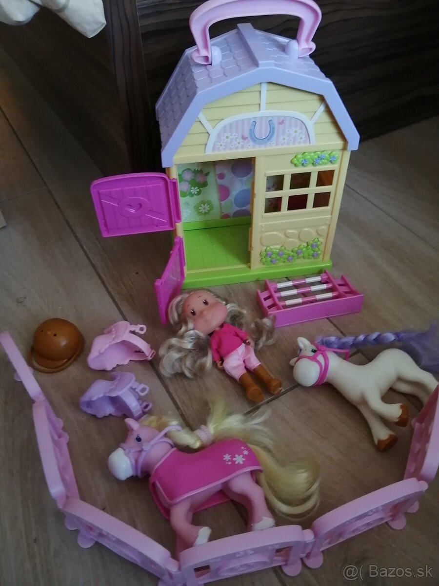 Obsahuje skladací domček, dá sa z jednej strany otvoriť a máme predzáhradku, druhá strana má jedny dvere otváracie a koník je ako v klasickej stajni, hore na stodole je šuflík, mrkvička sa dá vybrať z truhlice a dá sa zavesiť, truhlica sa dá zavrieť. Koníky sa dajú osedlať, každý má svoje sedlo, alebo sa koník vyparádi na súťaž a môže skákať cez prekážku, ktorá je súčasťou. Dievča si môže nasadiť prilbu, vyzliecť sa (suchý zips, zapínanie vzadu na gatiach už bohvieako nedrží), ohrádka sa dá rozobrať na jednotlivé diely, ako kto potrebuje, jediné čo je vidno, že je hrané, sú vlásky, hrivy a chvosty na koníkoch,už sú aj miestami zakundolené, ale tomu sa nedá predísť je to ozaj dokonalá hračka a relatívne sa dá pekne poskladať a preniesť a vziať si sebou trebárs na dovolenku, na prázdniny k babke...