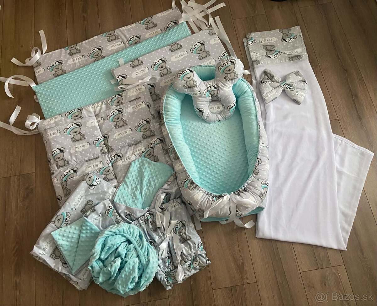 Hniezdo, vankúšik proti preležaniu, baldachyn, organizer 60x60, obliečka na paplón, obliečka na vankúš na suchý zips , plachta, zavinovačka.