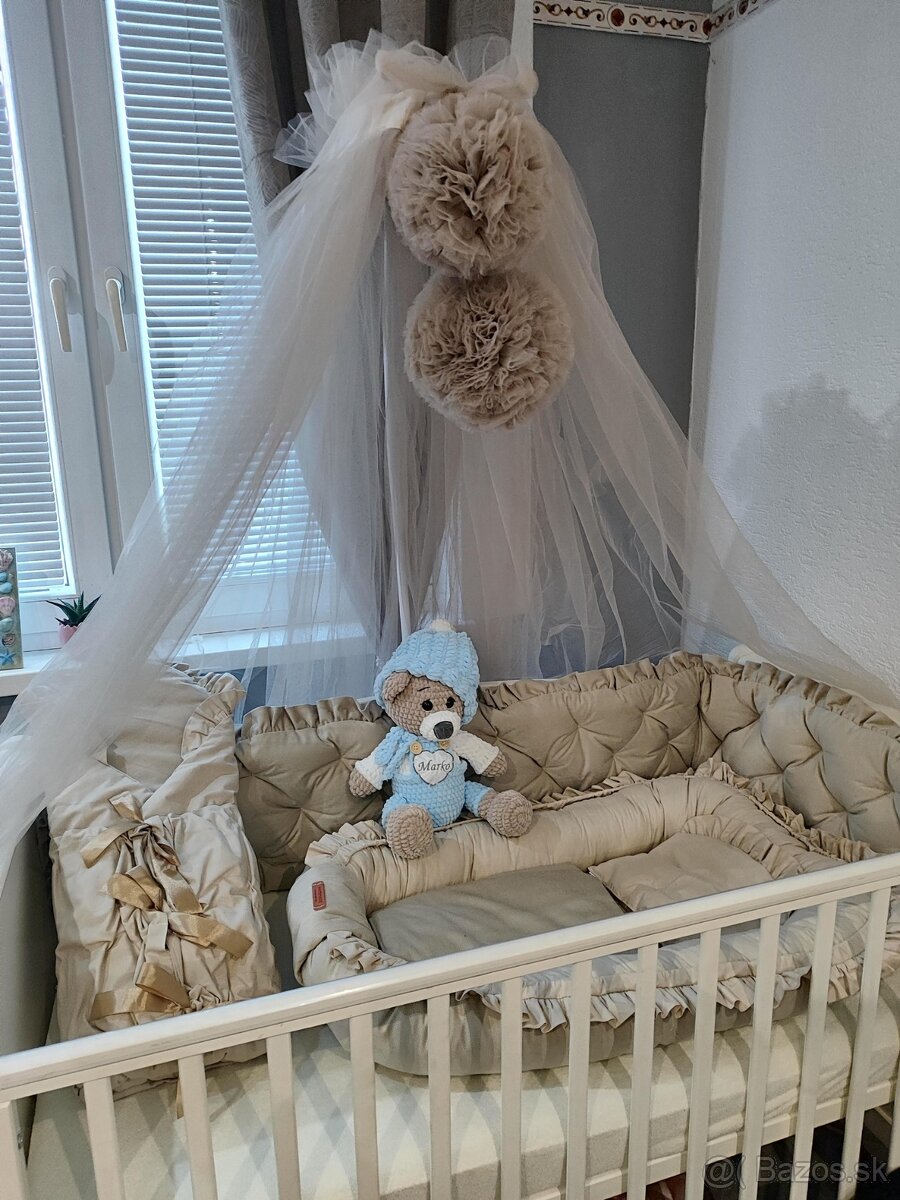 Krásna sada pre bábätko obsahuje:zavinovačku,luxusný prešívaný mantinel ,hniezdočko ,stojan na baldachýn a krásny bohatý baldachýn POM.