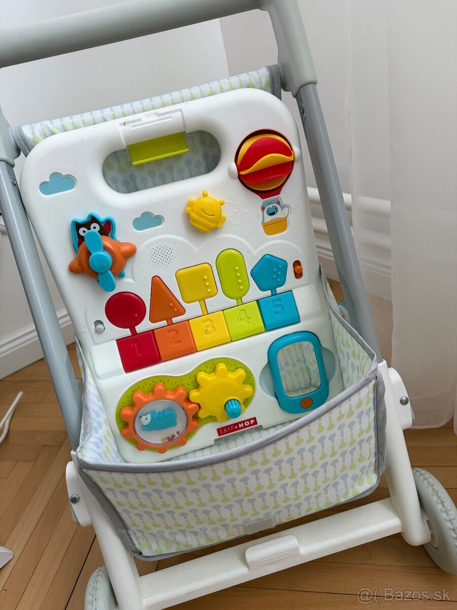 Skip Hop 4v1, od 6m. Na chodítku sa dá nastaviť výška rukoväti, nastaviť rýchlosť koliesok, odobrať hrací predný panel (zvuková klávesnica, nastavuje sa hlasitosť a prehrávajúce zvuky +iné aktivity), neskôr sa da použiť ako vozík/ kočík. Chodítko je v super stave