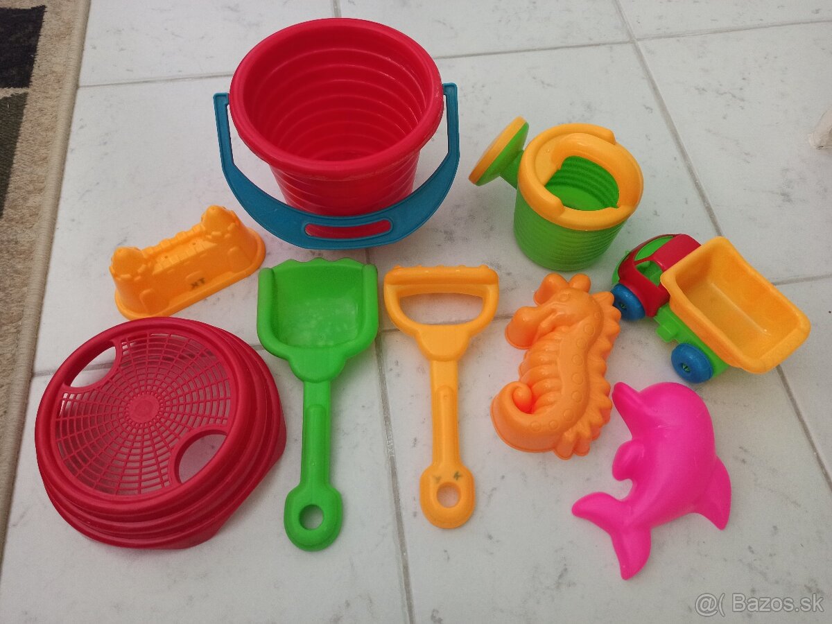 Vedierko, sitko, krhlička, lopatka, hrabličky, formičky, autíčko.