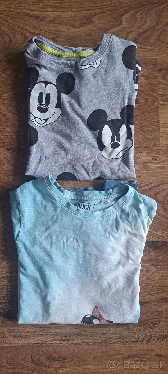 Predám tričká s krátkymi rukávmi - 2ks. Nosené, ale ešte poslúžia. Bez poškodení. Vidno známky prania. Značky: CaA a Mickey Mouse. Cena spolu: 3€ + pošta