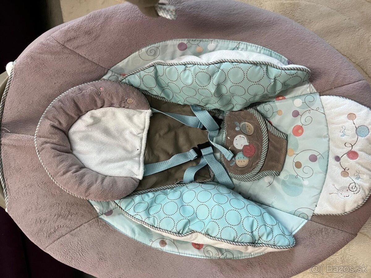 • Kreslo je hrubé, plyšové a je navrhnuté pre maximálne pohodlie bábätka. Nechýba ani vankúšik pod hlavičkou pre podporu a kolotoč, ktorý zaujme bábätko