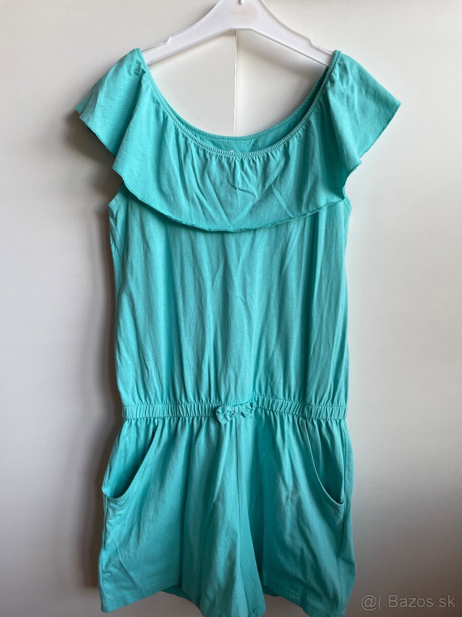 Predám bavlnený tyrkysový dievčenský overal bez rukávov s krátkymi nohavicami, veľkosť 158-164 cm, 12-14 rokov, dve bočné vrecká, cena 7 EUR + poštovné