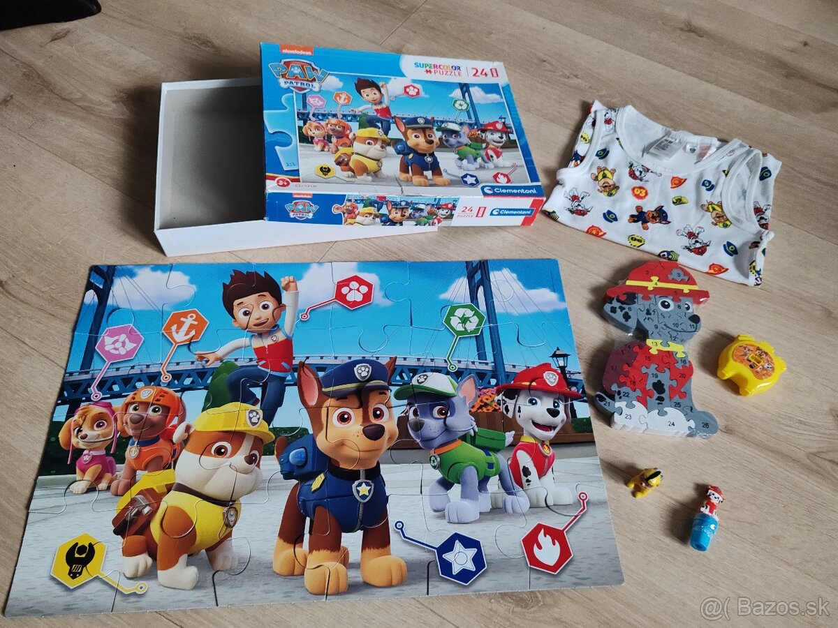 Predám mix veci s motívom Paw patrol. Nové tielko v. 134 z HM, nové drevené puzzle s číslami, figúrka, pečiatka, väčšie puzzle pre začiatočníkov (hrane, veľmi dobrý stav)