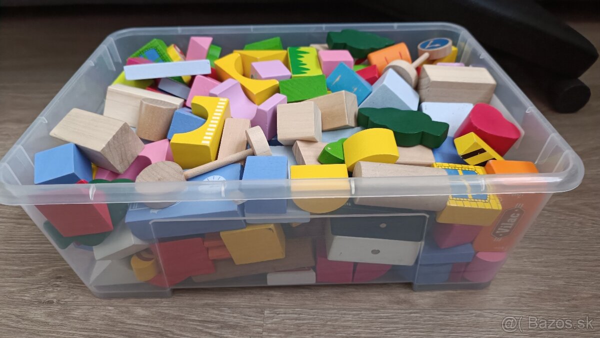Stavebnica drevené kocky - [6.4. 2026]Predám stavebnicu drevené kocky vrátane motorickej hračky - dreveného vláčika s 2 vagónmi a odnímateľnými kockami a 3 drevenými autíčkami.