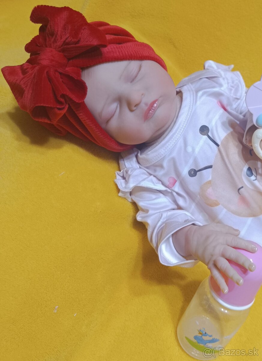 Na predaj realistické spinkajúce miminko 50cm. Ruky, nohy, hlavička je vinyl a mäkké bruško. Súčasťou je magnetický cumeľ, kombinéza macko, turbanček, kojenecká fľaša, plienka. Cena 50€