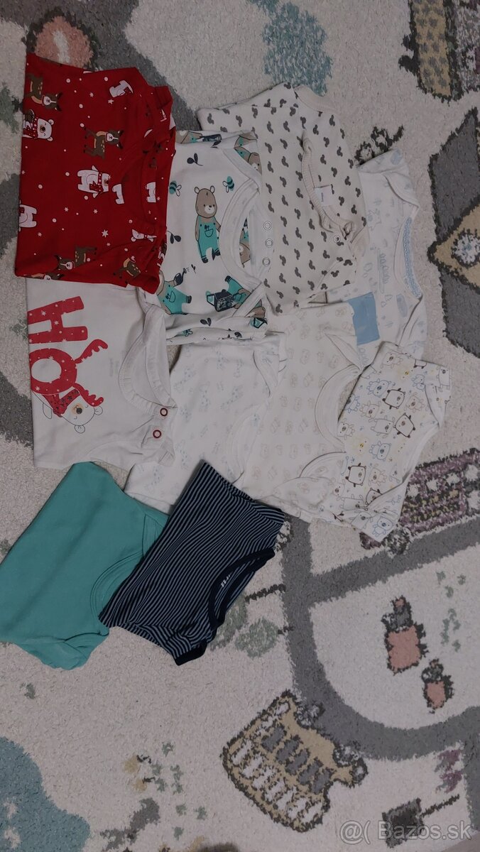 Detské oblečenie - [2.4. 2026]Predám balík detského oblečenia - body s dlhým a krátkym rukávom, tepláky, šaty, pyžamo, legíny a mikinu veľkosti 56 - 74 ako na fotke, všetky spolu za 10 eur. Nenosené, len opraté