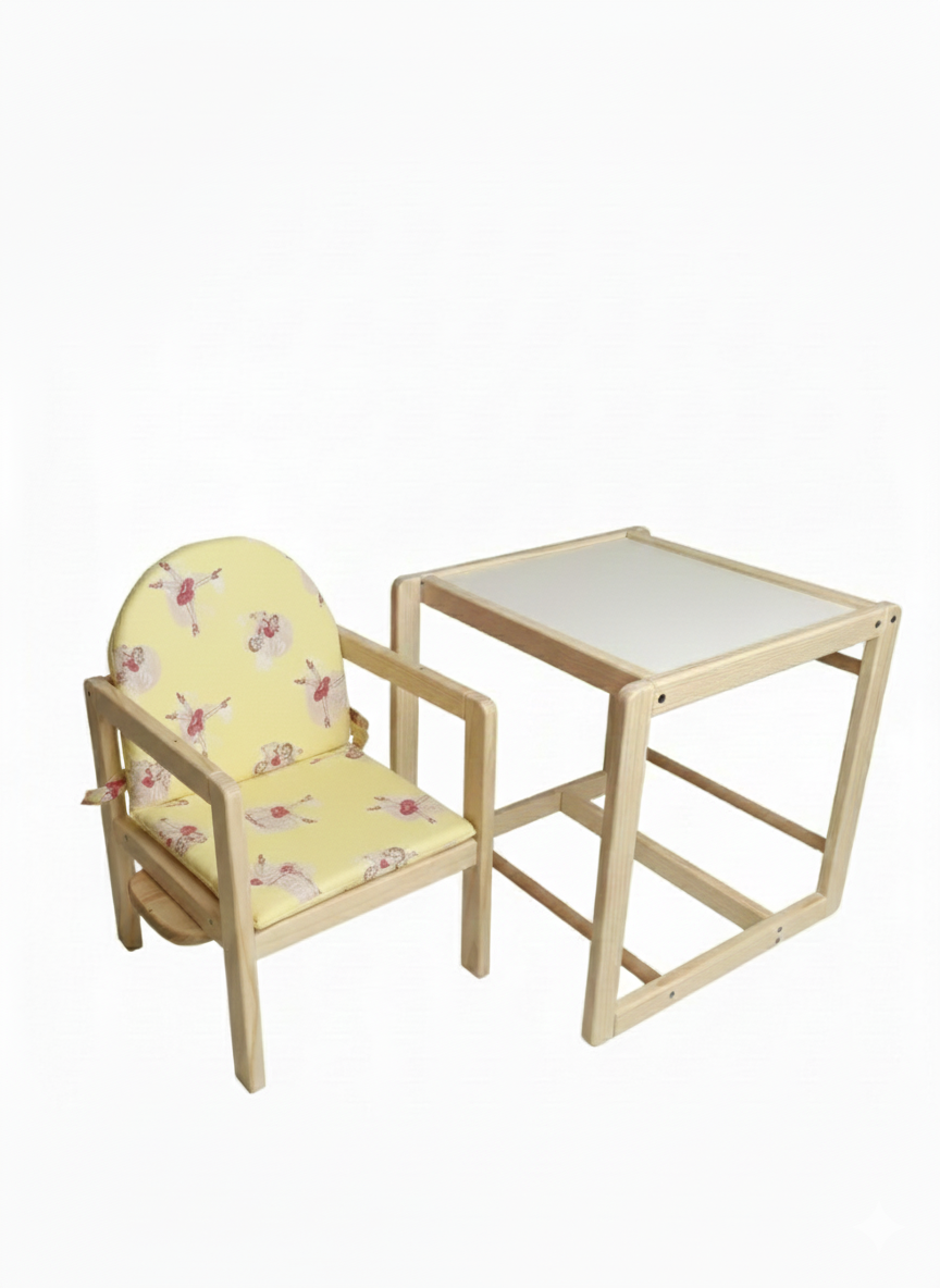 Detská drevená stolička je vhodná na kŕmenie detí pri jedálenskom stole alebo v rozloženom stave ako samostatný stolík a stolička na kreslenie, jedenie a hranie. Drevo je ošetrené lakom na detské hračky a nábytok. Poťah stoličky je k dispozícii vo viacerých farbách.