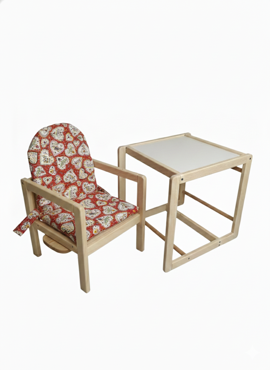 Detská drevená stolička je vhodná na kŕmenie detí pri jedálenskom stole alebo v rozloženom stave ako samostatný stolík a stolička na kreslenie, jedenie a hranie. Drevo je ošetrené lakom na detské hračky a nábytok. Poťah stoličky je k dispozícii vo viacerých farbách.