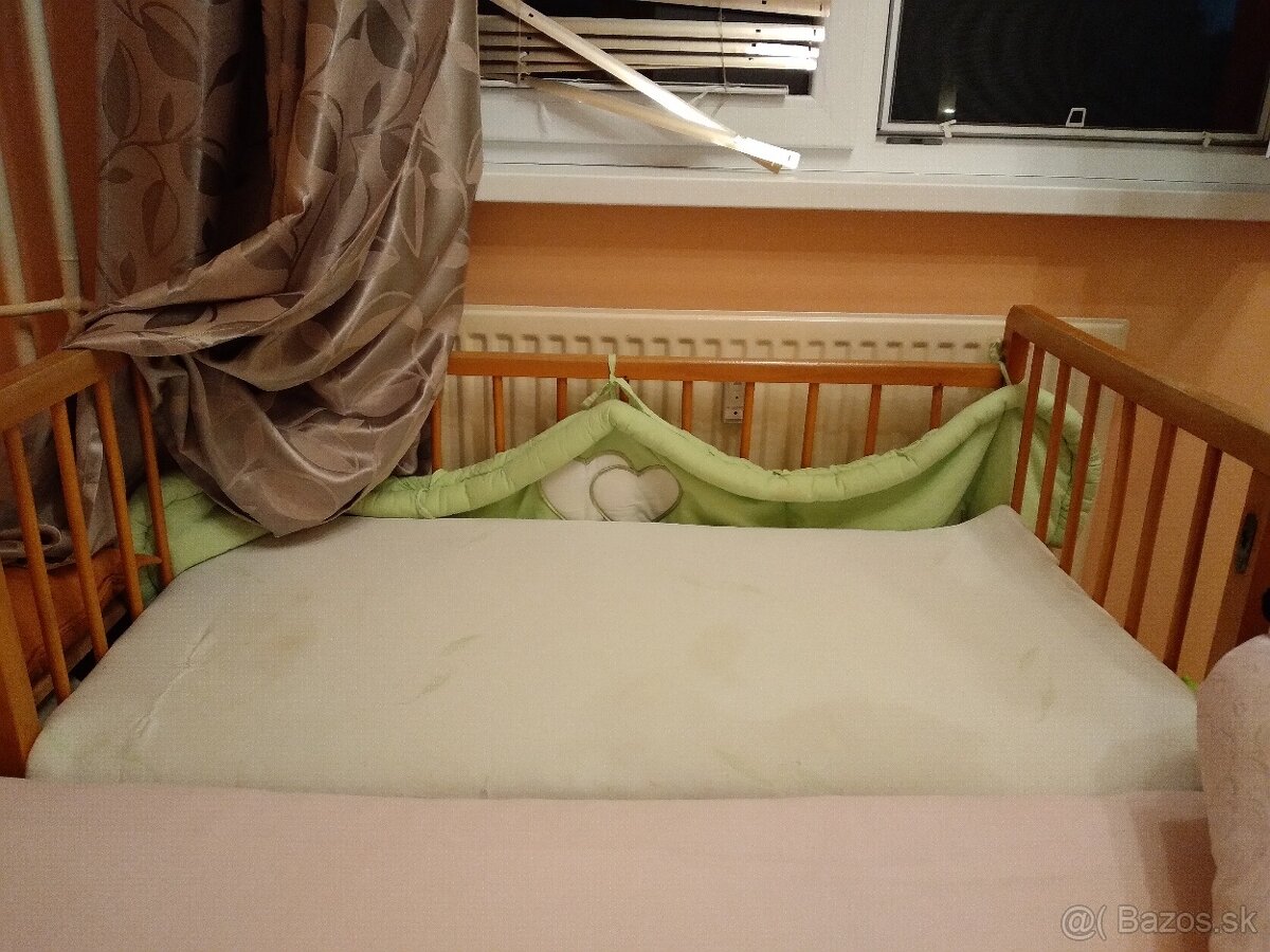 Predám drevennu detskú postieľku s novým aloe vera matracom 120 x 60 cm