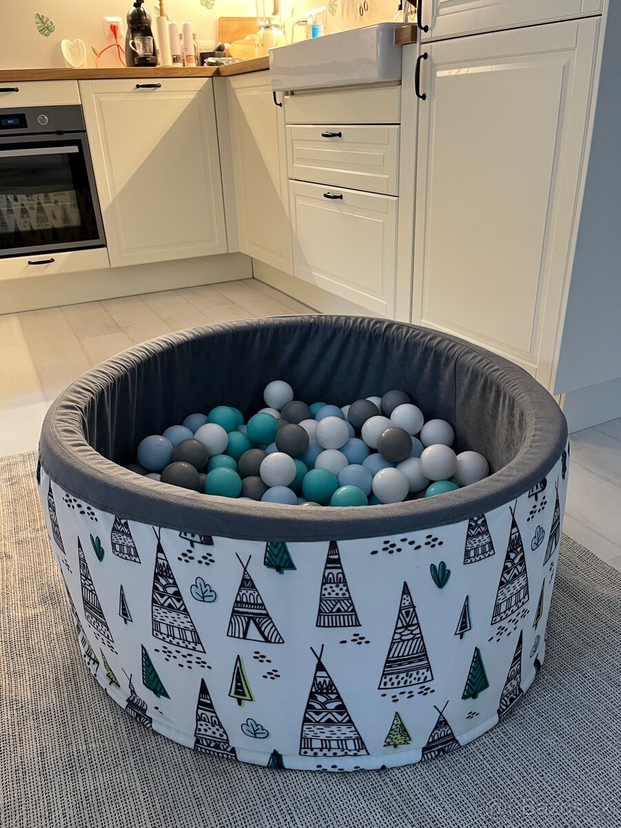 Posuniem suchy bazen, je ako novy, raz opraty v eko prasku. Gulicky su z certifikovaneho plastu, bazen ekotex kvality. Kupili sme ho tu: https://www.elisdesign.sk/detsky-suchy-bazen--90x40--s-loptickami-200-ks-teepee/