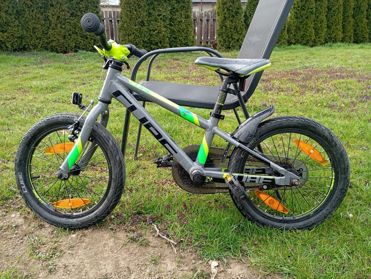 Predám detský bicykel Cube so 16 palcovými kolesami. Bicykel je plne funkčný, pripravený na používanie. Predná brzda čelusťová, zadná protišlapacia. Plný kryt na reťaz, pomocné kolieska.