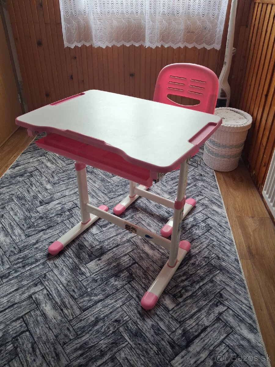 Predám ružový, výškovo nastaviteľný písací stôl so stoličkou pre malého školáka, iba osobný odber neposielam