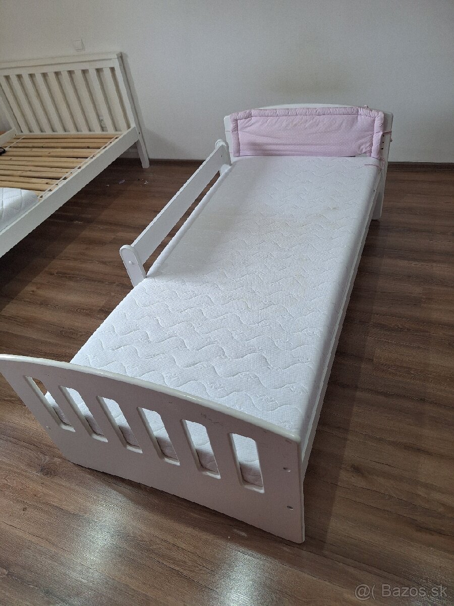 Používaná detská posteľ s matracom, roštom, zábranou a odkladacím priestorom pod posteľ s kolieskami na jednoduchšie vysunutie ktorý ale nieje na foto. Chýba bočnica. Rozmer 180x80cm