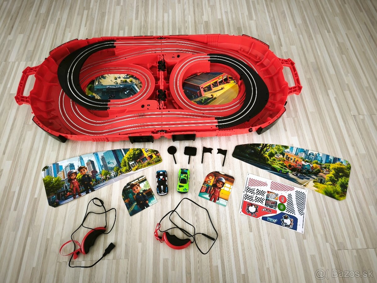 - vhodná pre deti od 3 rokov, napájaná na batérie (4xAA) alebo dobíjanie cez USB-C. Dráha je integrovaná v prenosnom kufríku a obsahuje rovinky, zákruty, ovládače, zabudované počítadlo kôl a dekorácie s motívom policajnej naháňačky a nálepky.